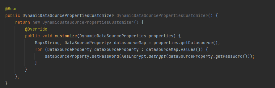 对于 mybatis-plus 中对数据库连接的 url、username、password 等等配置参数的加解密,或者别的初始化处理。官方是有推荐的方式加解密,也很方便,但是奈何咱们这边需要使用自己加解密。我看到了原来的实现是通过注入 YmlDataSourceProvider 来实现,不过因为默认就会加载一次,然后再注入一个 provider 会导致加载两次,出现数据库连接数翻倍的情况!解决是通过如下方式注入一个实现 DynamicDataSourcePropertiesCustomizer 接口的 Bean,用来完成初始化。